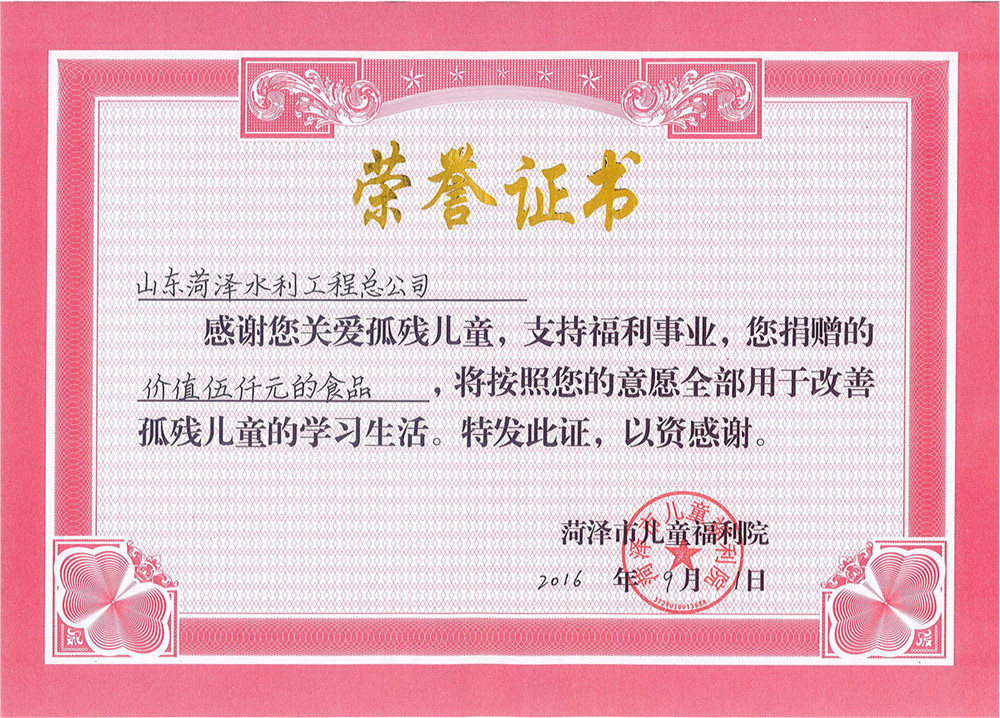 積極助力見(jiàn)義勇為募捐活動(dòng),僅僅山東菏澤水務(wù)工程有限公司踴躍奉獻(xiàn)愛(ài)心、積極回饋社會(huì)的一個(gè)縮影。自2015年以來(lái),山東菏澤水務(wù)工程有限公司多次到菏澤福利院慰問(wèn)并捐贈(zèng)物資。自公司成立以來(lái),堅(jiān)持將中華優(yōu)秀傳統(tǒng)文化融入企業(yè)文化建設(shè)之中,將誠(chéng)信忠厚、勤勞敬業(yè)、開(kāi)拓進(jìn)取、服務(wù)社會(huì)、實(shí)業(yè)報(bào)國(guó)等優(yōu)良傳統(tǒng)精髓,灌輸?shù)矫课粏T工的思想當(dāng)中,使之成為人生奮斗、企業(yè)發(fā)展的源動(dòng)力,更體國(guó)有企業(yè)應(yīng)有的服務(wù)意識(shí)和責(zé)任擔(dān)當(dāng)。